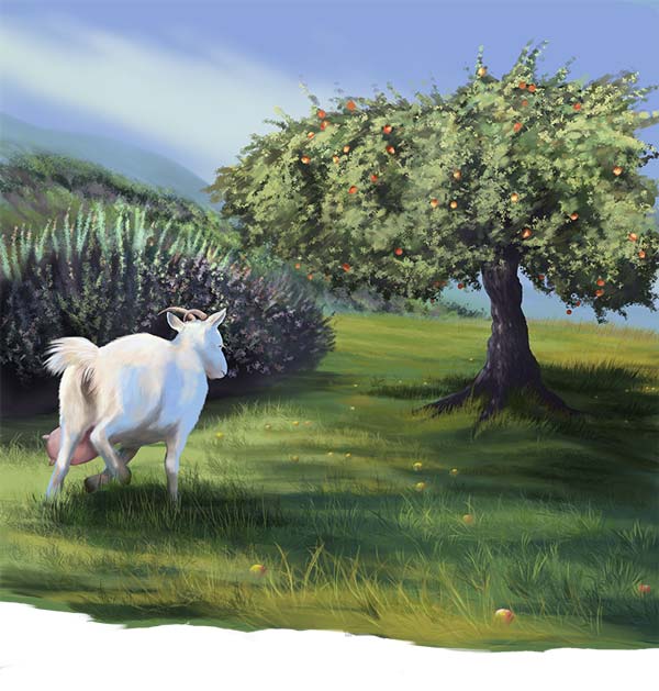 Sie schimpften: „Igitt, Grete hat alle Äpfel angebissen!“ So hatte sich die Geiß täglich eine Extraportion Äpfel gesichert.