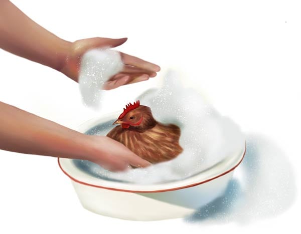„Du kannst mir nachher helfen beim Hühner baden“, sagte Oma. „Die Hühner sind doch gar nicht dreckig“, rief Ben erstaunt. „Trotzdem tut ihnen das Baden gut“, versicherte Oma, „zufriedene Hühner legen schmackhafte Eier.“