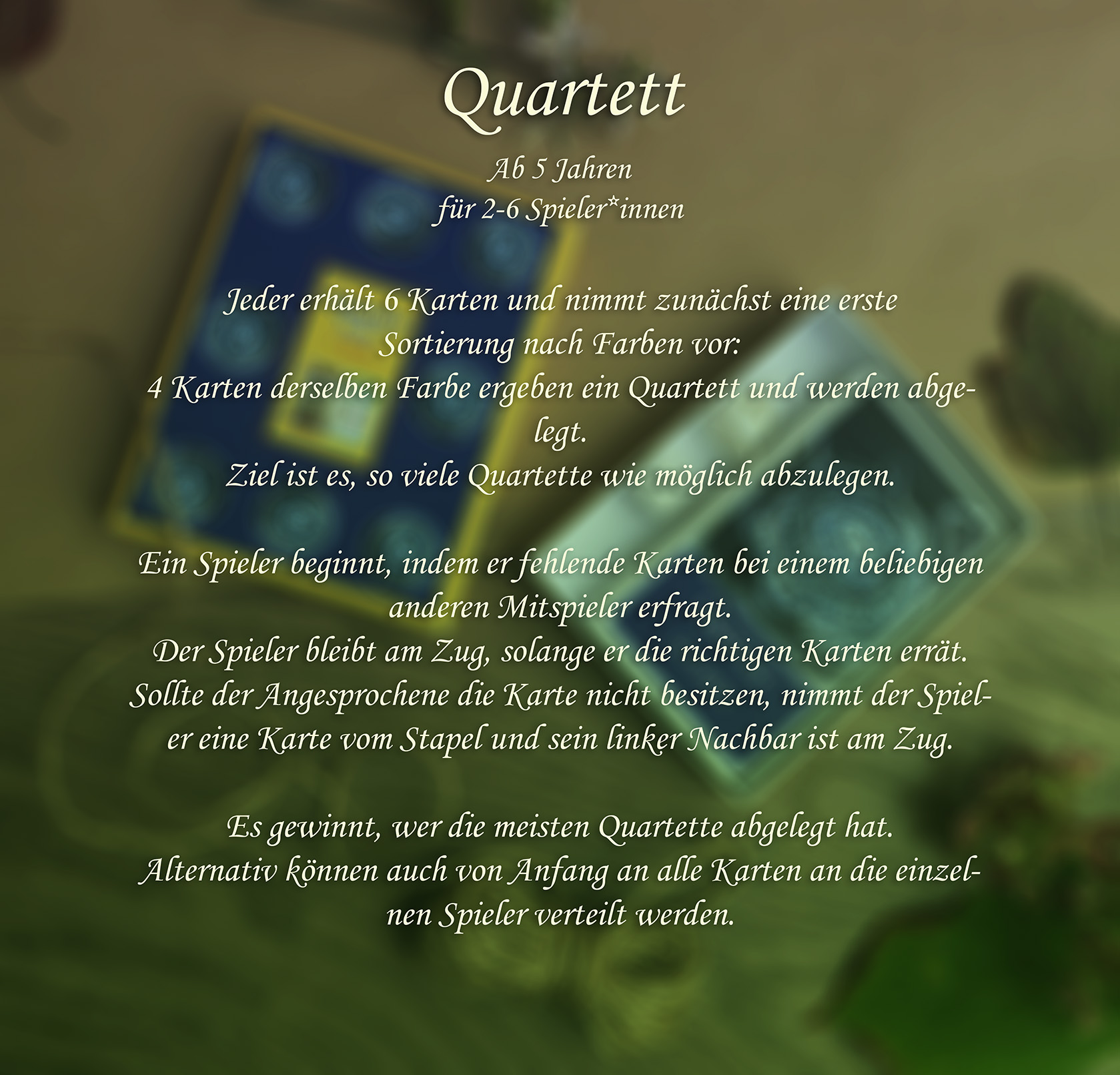 4 Karten derselben Farbe ergeben ein Quartett und werden abgelegt.