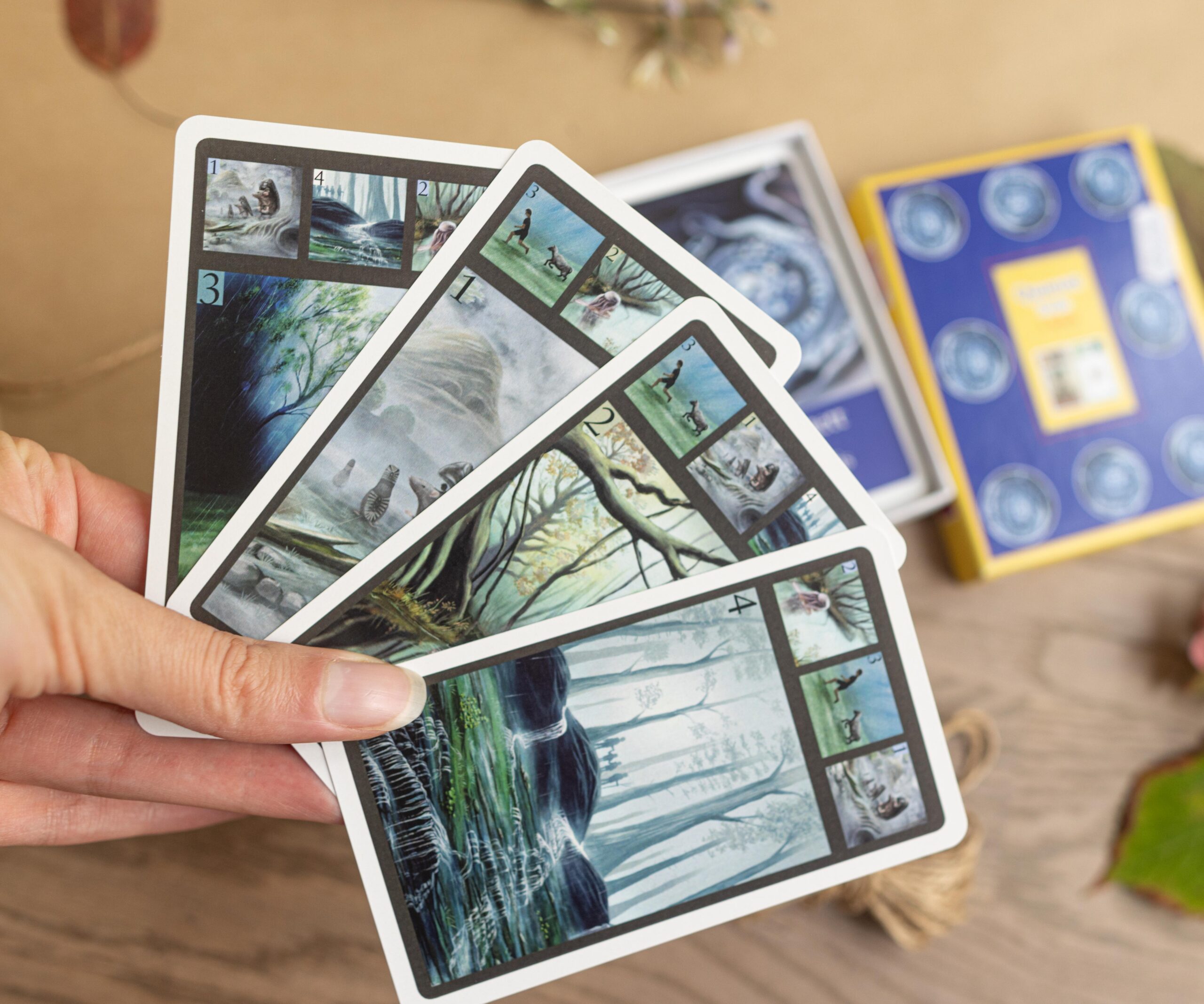 Alle Spielkarten werden gemischt und in 4 gleichen Stapeln um die Schachtel herum verteilt. Die Spielfigur steht auf der Schachtel auf einem Feld.