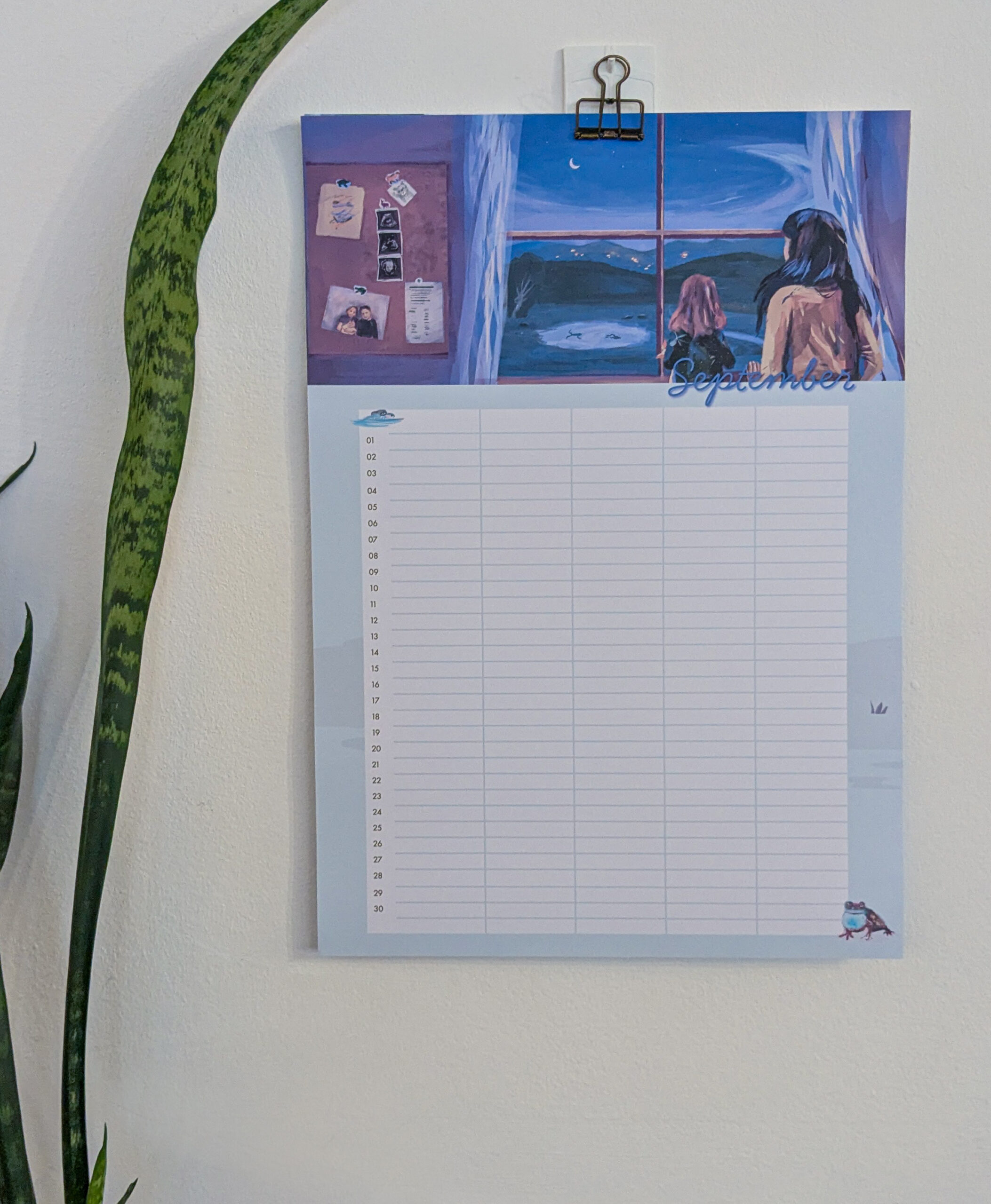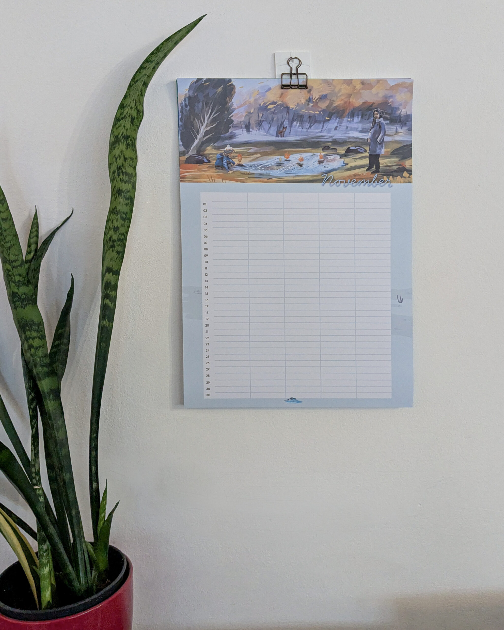 Zeitloser, immerwährender Familienkalender mit Pfützenillustrationen rund ums Jahr mit 5 Spalten. Klammer kann wiederverwendet werden und Rückseiten können z.B. zum Malen verwendet werden.