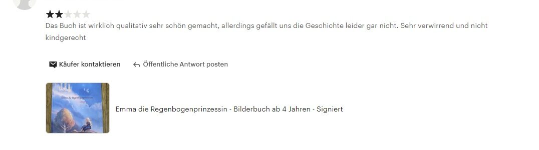 Ich schaue auf mein Handy, denn eine neue Meldung ist aufgeploppt auf Etsy. Jemand Fremdes, der unser Buch gekauft hat, hat eine Bewertung geschrieben. Juhuu! Ich gehe voller freudiger Erwartung auf die Seite. Doch dann kommt der Schock. Jemand hat uns nur zwei Sterne gegeben und findet unsere Geschichte…. „verwirrend und nicht kindsgerecht.“